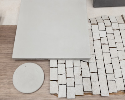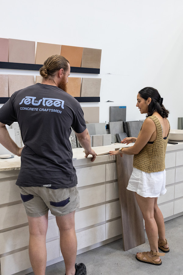 We spent the day at Set in Steel in Unanderra with owner Jared, selecting the perfect concrete finishes for our basins, kitchen islands, and benchtops throughout both dwellings. Walking into the workshop with our joinery samples in hand, we were immediately impressed by the range of concrete colours available. Matching materials is always a delicate process - you want everything to complement each other without being too matchy-matchy. Having our kitchen joinery samples made it so much easier to visualise how the concrete would work alongside the timber tones we've chosen.