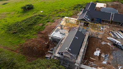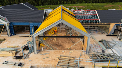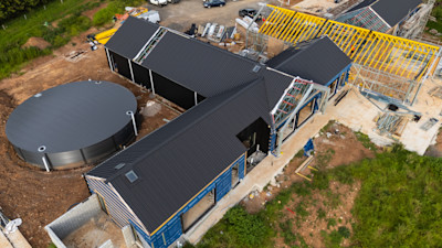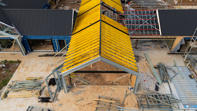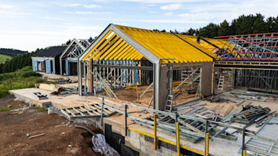 The main dwelling is seriously taking shape now! Steel frames are locked in, rafters are running, and the roof is going on - well, sort of!