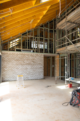Sometimes the best design decisions come from necessity! Originally, this wall was planned to be standard gyprock painted to match the rest of the room, but when we found out regulations required a non-combustible wall behind the freestanding fireplace, we had to rethink our approach.